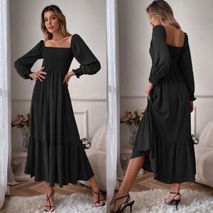 Shirred bust square neck long sleeve ruffle maxi dress boho gypsy rust brown