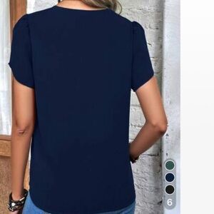 Short sleeve scalloped petal sleeve v neck blouse work navy blue