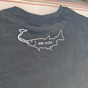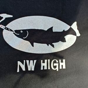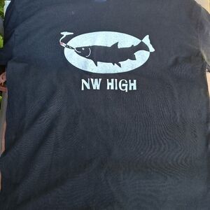 never worn, with graphics on front, back and an arm sleeve. NW High with smoking fish on front from the Pacific NW combines fishing with pleasure. Back of shirt has a smaller graphic of a smoking fish.