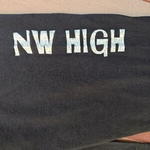 Left sleeve says "NW High". This shirt is unisex.