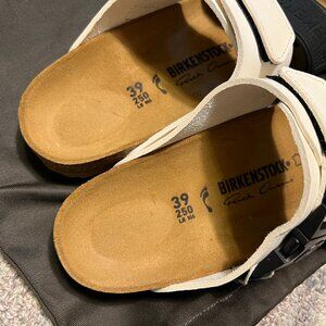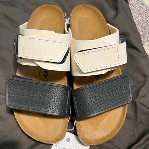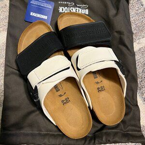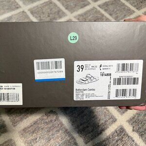 Functionality and handcraftsmanship combined: the Rotterdam sandal boasts a sporty and elegant look. The top strap made from leather, which is closed with a clip fastener and attached to a hook-and-loop fastener, can be adjusted in size. The wide cowhide hook-and-loop strap on the front sports the Birkenstock logo.
