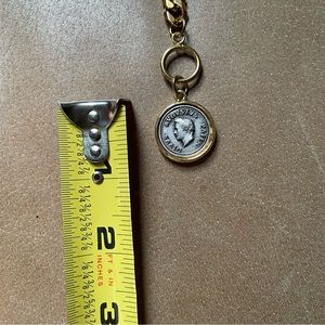 Gold and silver plated brass Roman augustus coin pendant charm adorns this gold plated stainless steel curb chain toggle choker necklace.