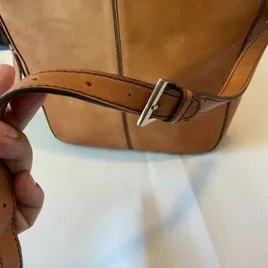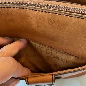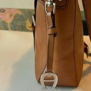 Etienne Aigner Shoulder Bag. Genuine Leather. Front Buckle Accent. Adjustable Strap. Lined. One Outside Slit Pocket. Two Inner Open Compartments. One Inner Zippered Compartment with One Internal Slit Pocket & One Zippered Pocket. * Slight Discoloration on Back Side of Bag. Please See All Photos.