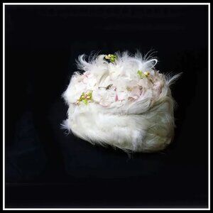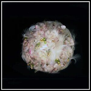 It looks like a birthday cake with lots of whipped cream! Exquisite. It may have once been someone's perfect Easter bonnet. Swirled softest white egret feathers around the biggest part of this confection. Some curled egret feathers on top, mixed in with the pink silk flowers. In between, you will see all the pearly pink touches mixed in. It curves a bit higher on the sides. The inside was all restored with pink satin lining so there are no labels, But there may be labels under the lining, but do you really want to take it out in check? That is up to you. CONDITION: outside is flawless, one small stain on the inside (shown). late 50s to early 60s vintage.