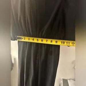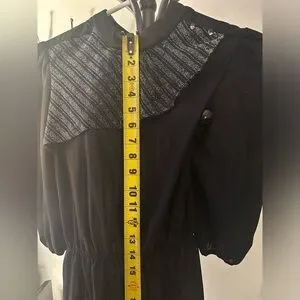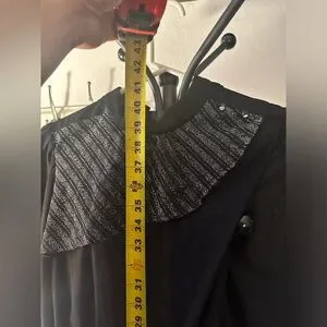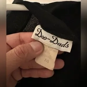 Late 1970s Vintage Doo-Dads Shirt Dress-Ruffle. Size 7/8. 11” on the waist, 40” from top to bottom, and 14” top to waist. Ruffled Metallic Striped Lurex Neckline With Small Buttons On Left Shoulder-Elbow Length Sleeves With Stretch At Hem-Stretch Waist With Matching String Tie For Custom Fit-Button Up Back Closures-100% Polyester