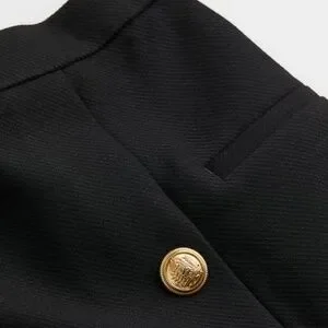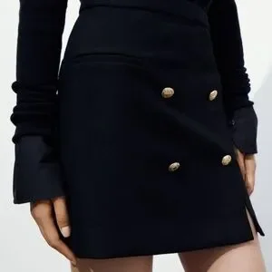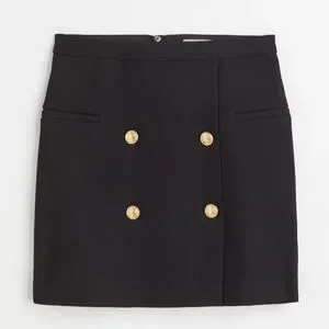 Short, fitted skirt in woven fabric. Covered elastic at waistband, concealed zipper at back, and mock welt pockets. Decorative buttons at front with a slit.