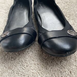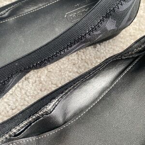 Black Coach Chelsey flats. Easy slip on. Used condition - Inner lining has detached from hem - 1 side in each shoe (see pics). Small scuff on one front toe. Outsides are in great shape. Size 7B.