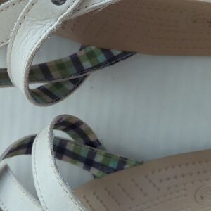 Gently pre-owned, discoloration, marks and scuffs noted, there is also a tiny hole on the outside of right sandal (it appears to be where the store tag was, see pictures