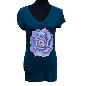 Hand Printed Upcycled Women Medium Purple Blue Succulent Cactus Short Sleeve Tee