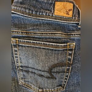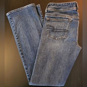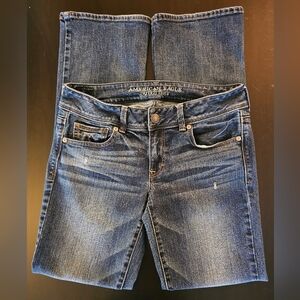 Like New! Only worn once! Great Jeans! Women's American Eagle Bootcut Jeans with small manufacturers distressed marks throughout front of jeans. See photos. Jeans state size 8 regular. Color may vary due to camera lighting.
