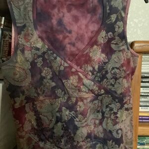 Size large but RUNS very small. Decorative stones and embroidery with v. eco. Made of a T-shirt like material but you can’t tell to look at it as it can be worn with very dressy slacks,skirt or dressed down with shorts or jeans. Machine washable. Please note I am usually a small or medium so this top runs small.
