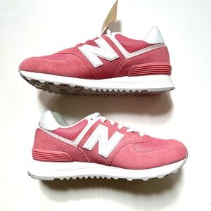 NWT New Balance 574 in bubble gum pink. Size 7. Made of suede, faux leather and textile. Closet staple.