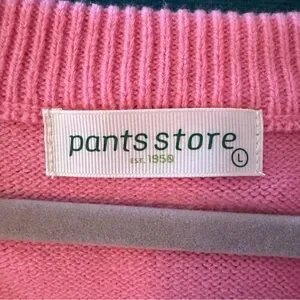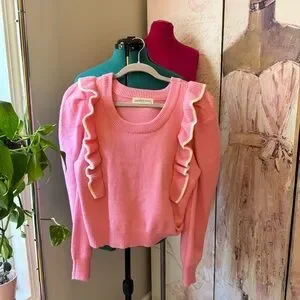 The Monica sweater by the Pants Store brand est 1958. Beautiful pink with two ruffles with white trim. Puffy shoulders. Very girly/feminine. Super cute, I am so sad I cannot wear this size. New w/o tags.