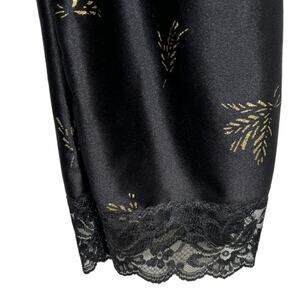 Vintage 70s Dolores For Poirette Black Sleepwear Jumpsuit. Black silky satin with allover gold leaf wheat print. Lace straps can be worn on or off shoulders. Elasticized waist. Lace trim at ankles. Union made.