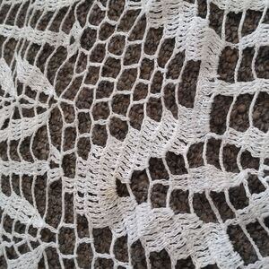 Is in decent vintage used condition. Is between white and off white in color. Has minimal staining- please see photos 5, 6, and 7. Hard to see in the photos too. Photos 8, 9, and 10 show minor damage in a few places. It's approximately 31" in diameter. No brand or known designer.