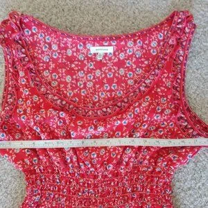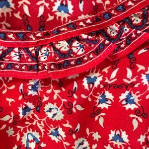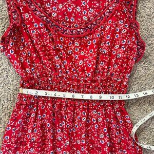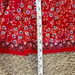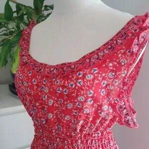 Figure flattering, red floral maxi dress with elastic ruched waist. Floaty material that moves beautifully and doesn’t wrinkle!