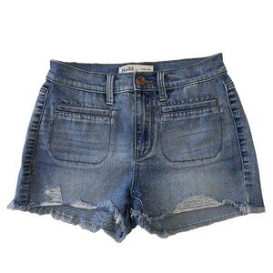 Mudd FLX Distressed Denim Jean Shortie Junior SZ 3 Blue Frayed Hem High Rise