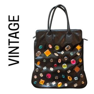 90s Large Tote Patent with Faceted Gemstones Black Zipper Lined Pockets Vintage