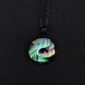Beautiful Aurora Borealis / Northern Lights dome style pendant necklace. Black back and adjustable chain.