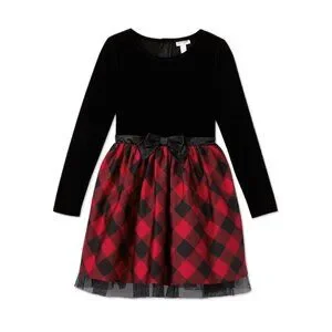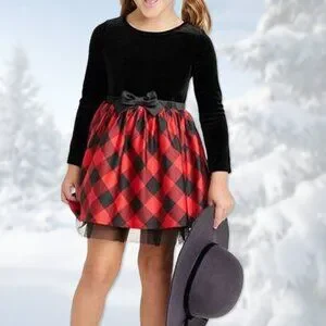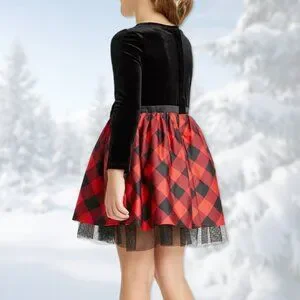 NWT Black Velour & Red Buffalo Check Long-Sleeve Dress - Girls Size L (10/12)