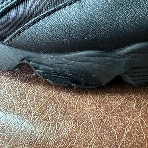 All black sneakers small wear and tear on left side of the sneakers. Still in great condition.