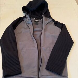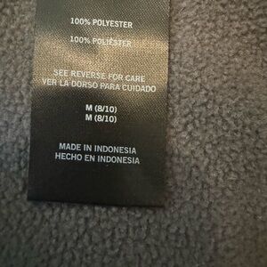 Ribbed sleeves and hood. Thick, comfortable 💯 polyester.