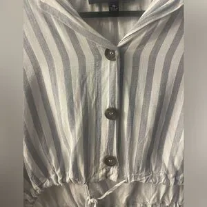 White with blue striped collard shirt. Brown buttons down front with tie at the bottom to cinch as much or as little as you’d like. Worn once. Excellent condition.