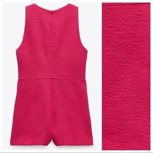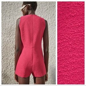 NWT. Zara Fuchsia Textured Sleeveless Playsuit/Jumpsuit with a V-neckline, false flap pockets on the front, Invisible back zipper closure. Size S. Ref. 2391/795. Pit to pit 17,5" flat, shoulders 11", waist 15,5", rise 13", inseam 1,5", length 28,5". DO4.