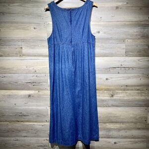 This is a pre-owned vintage Karen Scott Blue Sleeveless Lightweight Chambray Maxi Dress in a Size Large. This dress is in good condition with some general wash wear, no stains, and no damage. The dress has gray buttons up the side to the waist, a zipper down the back to the waist, and a square neckline. The chambray fabric is lightweight. I encourage you to enlarge the photos to view small details and to review the measurements on photo #11 to determine fit. If you have any questions about this item, please ask!