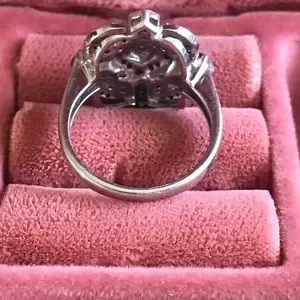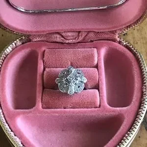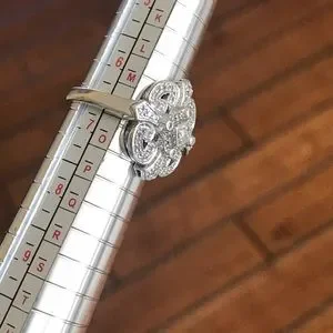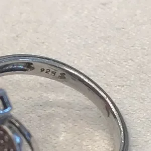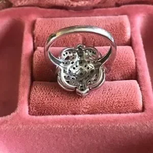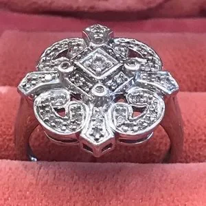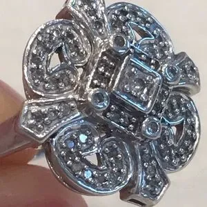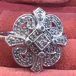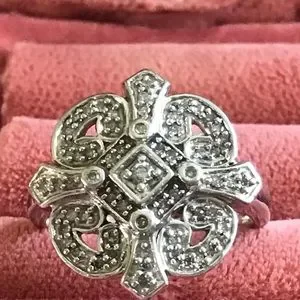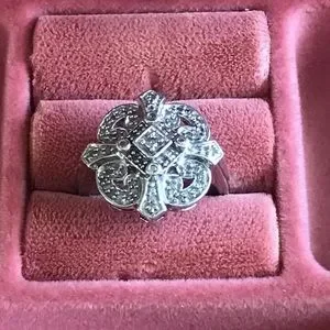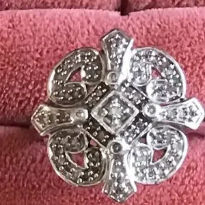 Really pretty with genuine diamonds set in sterling silver. I do not know karat weight. Approx size seven. Intricate design. Really sparkles in the light. Does not come with pink box only for display purposes.