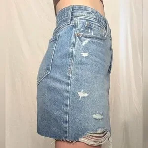 Long distressed jean skirt, buttoned up, high rise.
