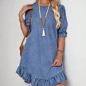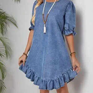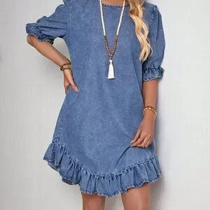 Blue Casual Women's Round Neck Short Puff Sleeve Denim Dress With Ruffled Hem