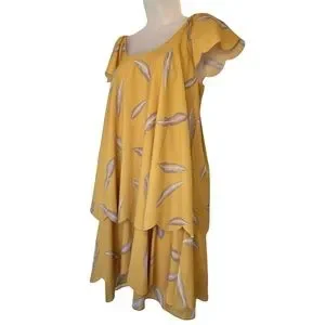 Karen Zambos KZ mini dress, size XS. Mustard yellow with fluttery sleeves, elastic at the shoulders (could probably be worn off the shoulder as well), tiered style with scalloped trim. Gray feather print. Flirty, subtle boho look, wear casual with an ankle bootie or dress it up for a more formal occasion. In excellent condition!