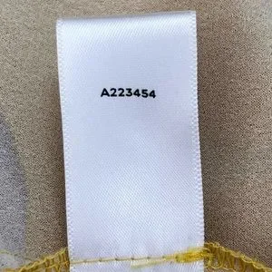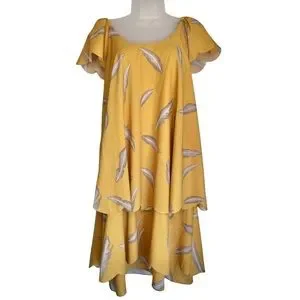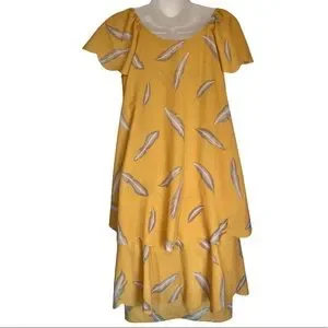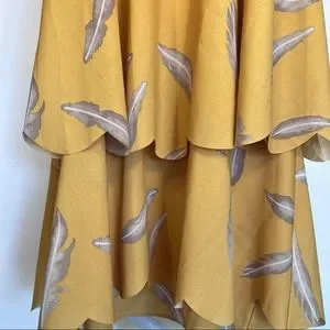 Karen Zambos KZ Feather Print Scalloped Dress Mustard Yellow Boho Size XS