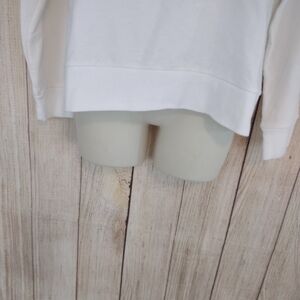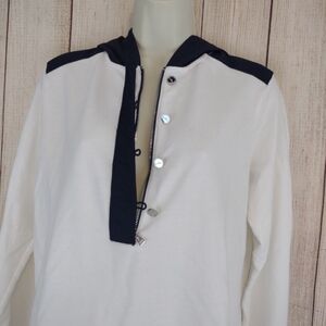 This is such a cute sweatshirt size medium, in like new condition. white with a navy blue hood, shoulder & front trim. 1/4 zip & logo button closure. very soft & comfy.