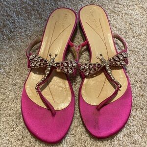 This is such a pretty pair of sandals by Kate Spade. They are constructed of a bright fuchsia satin with a rhinestone dragonfly on each one. They are a size 6 M.