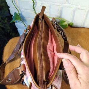 Bright and happy Bay Pink Plaid bag with brown trim
