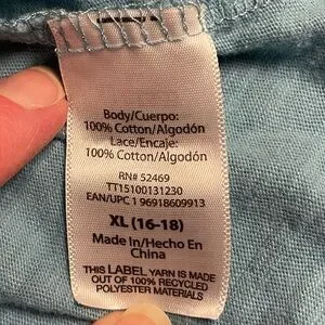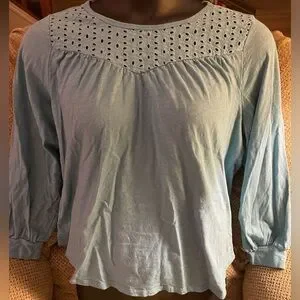 This light turquoise or teal shirt is super cute and comes from a smoke-free home. The tags have been removed but it has never been worn. The top section is an eyelet design and the bottom has a tunic feel. The material is lightweight and very soft. It is approximately 23 inches long with sleeves that are approximately 21 inches. It is loose-fitting and very comfortable. It is 100% cotton and can be washed in cold water and tumbled dry low.