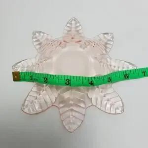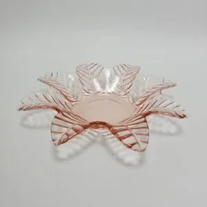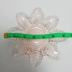 This charming vintage glass dish is perfect for serving candy, trinkets, or any small treasures. The delicate pink color and intricate floral pattern make it a wonderful addition to any mid-century modern decor. The ruffled edge and hand-blown glass production technique add a unique touch to this one-of-a-kind piece.