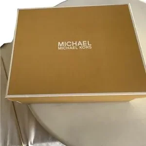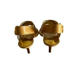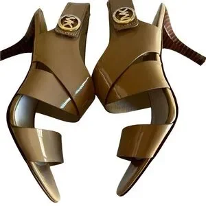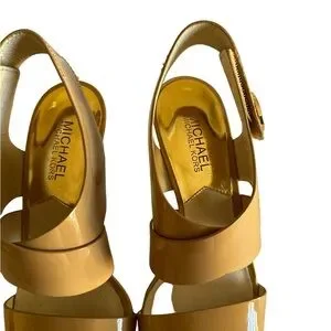 PREOWNED IN EXCELLENT CONDITION THESE BEAUTIFUL 3” HIGH HEEL SANDALS FEATURES A HIGH GLOSS LEATHER FINISH AND A VELCRO SLING BACK STRAP WITH THE GOLD MK LOGO. PLEZSE SEE NOTES FOR DETAILS