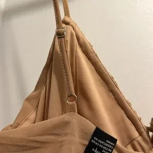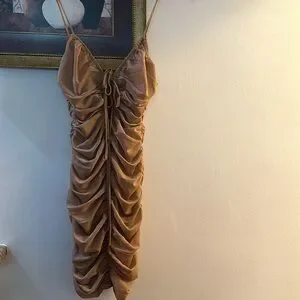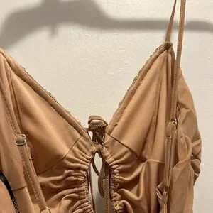 A knit mini dress featuring an allover ruched construction, bodycon silhouette, a V-neckline with crisscross halter straps, adjustable cami straps, straight-cut back, front drawstring cutout, and a concealed back zipper.