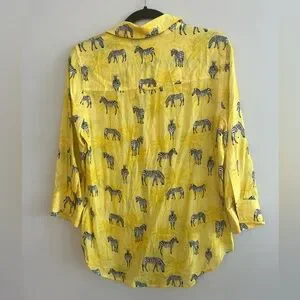 A timeless blouse that will never go out of style. Featuring a bold zebra print set against a maize-yellow palm tree background.