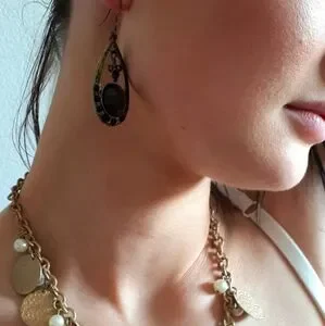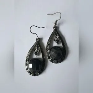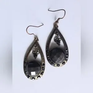 Gorgeous old-fashioned bronze coloured drop-shaped dangly statement earrings with black stones. Elegant, tasteful costume jewelry. Bundle with any item marked 3/$20 for discount (and pay one shipping fee).