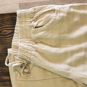 brown paperbag pant. lightweight wide leg with side pockets and elastic waist