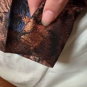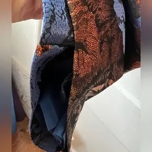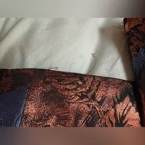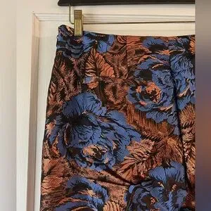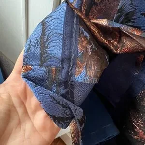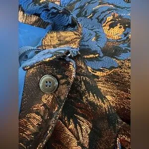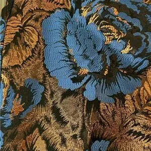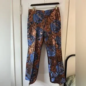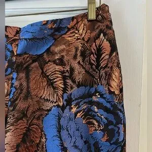 The absolute coolest pants I never figured out how to wear, and it’s time to let someone else enjoy them. Amazing metallic jacquard, bronze and blue, large floral print! Hemmed, but never worn! If you need them longer, there is leeway to take them out up to 1 1/4” again! A stray thread at the hem, but in otherwise perfect condition. Pleated front, high waisted!