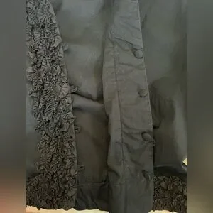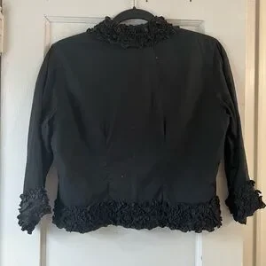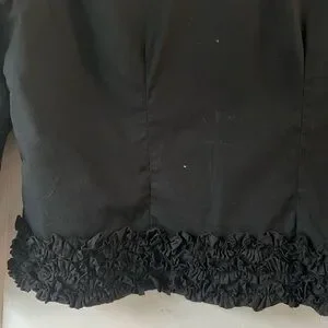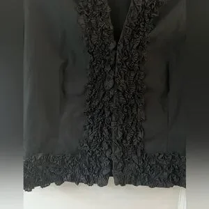 Beautiful made in France cropped top/jacket — ruffle along the neck & hem, sleeves. Body is lined, sleeves are unlined! Lovely illusion/sheer effect. Invisible button closure, 100% cotton! Spare button still attached. Anne Fontaine size 3, fits like a US 10ish. Small stain on one underarm, could easily be removed!