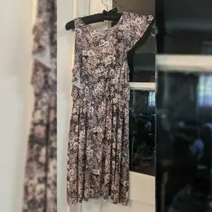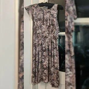 Dress features an elastic band at natural waist. Asymmetrical shoulder ruffle. Raw edges. Viscose/elastane blend (very stretchy). Light weight. All-over floral print with black, pink, white. and purple.