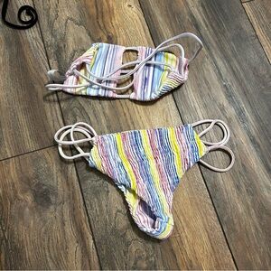 XS. Crayola bikini set. Triple strap bottoms and bandeaux top.