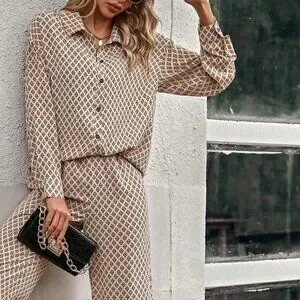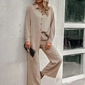 Apricot Casual Womens Allover Print Drop Shoulder Shirt & Wide Leg Pants