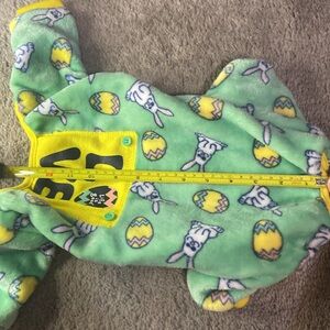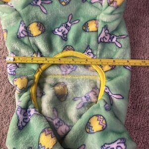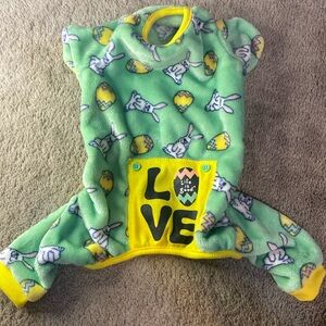 For sale is this pair of super soft fleece pajamas for a dog. These are size small and have Easter bunnies and Easter eggs all over them. There is yellow ribbed trim around the neck and leg holes.